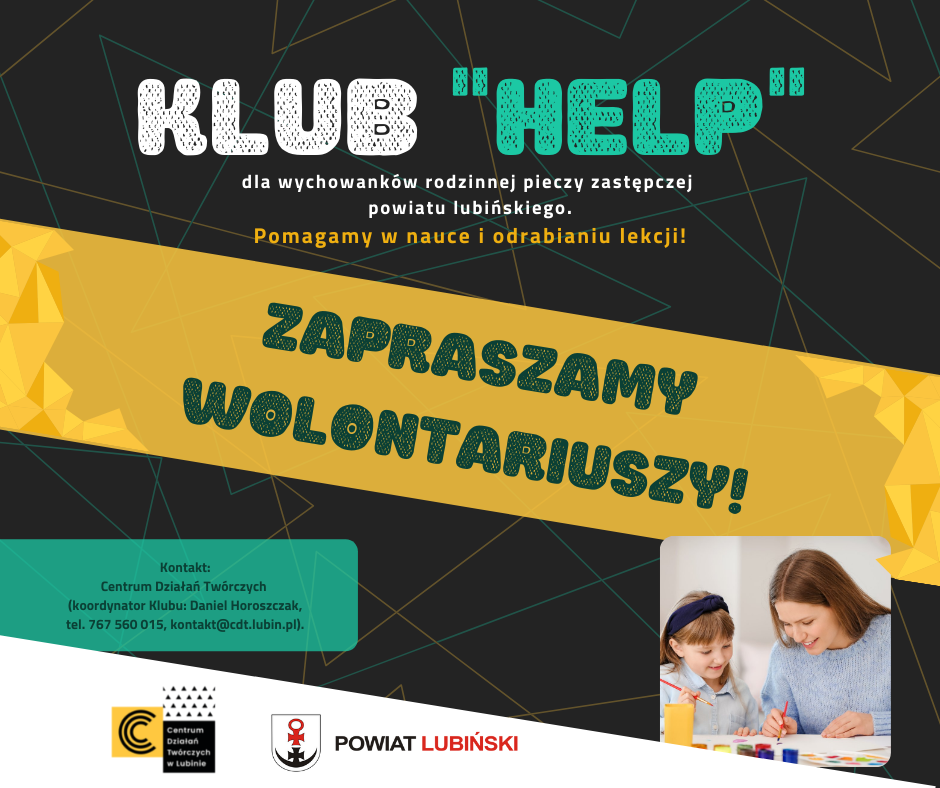 Zachęcamy wszystkich uczniów szkół ponadpodstawowych, nauczycieli oraz wolontariuszy z terenu powiatu lubińskiego do przyłączenia się do zespołu Klubu Help” wspierającego wychowanków rodzinnej pieczy zastępczej powiatu lubińskiego w przezwyciężaniu trudności w nauce. Szukamy pogodnych osób, które poświęcą swój czas i podzielą się umiejętnościami, starając się przy okazji stworzyć miłą i przyjazną atmosferę. Zapraszamy do kontaktu z Centrum Działań Twórczych (koordynator Klubu: Daniel Horoszczak, tel. 76 756 00 15, Ten adres pocztowy jest chroniony przed spamowaniem. Aby go zobaczyć, konieczne jest włączenie w przeglądarce obsługi JavaScript.).
